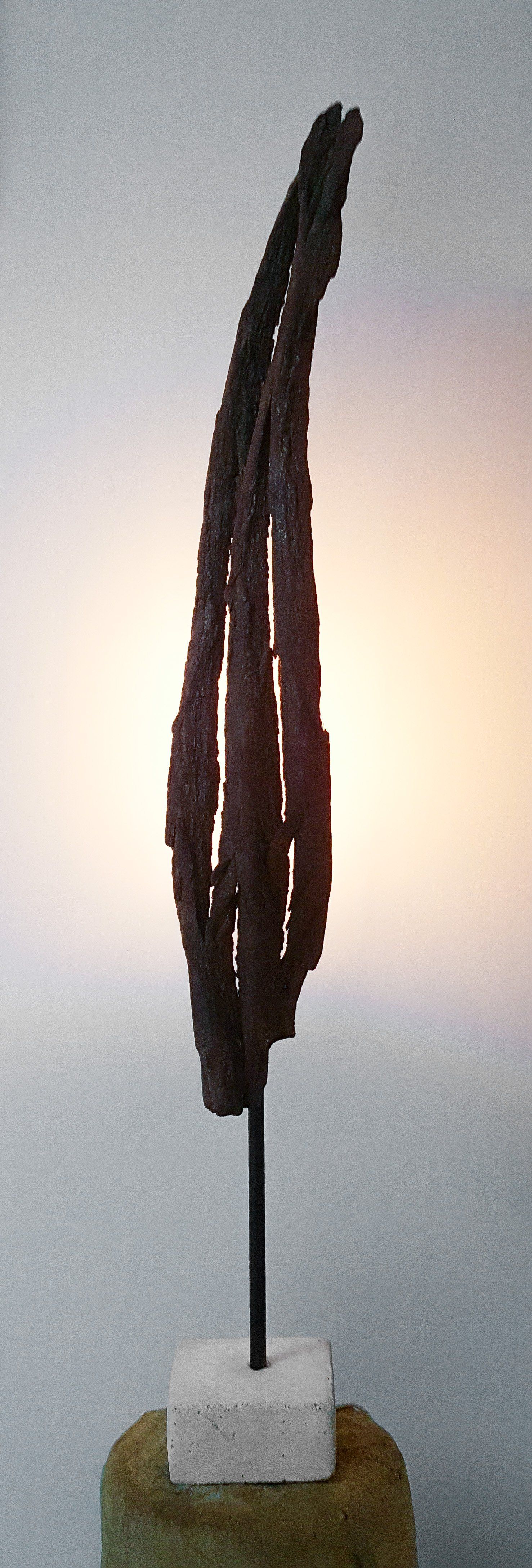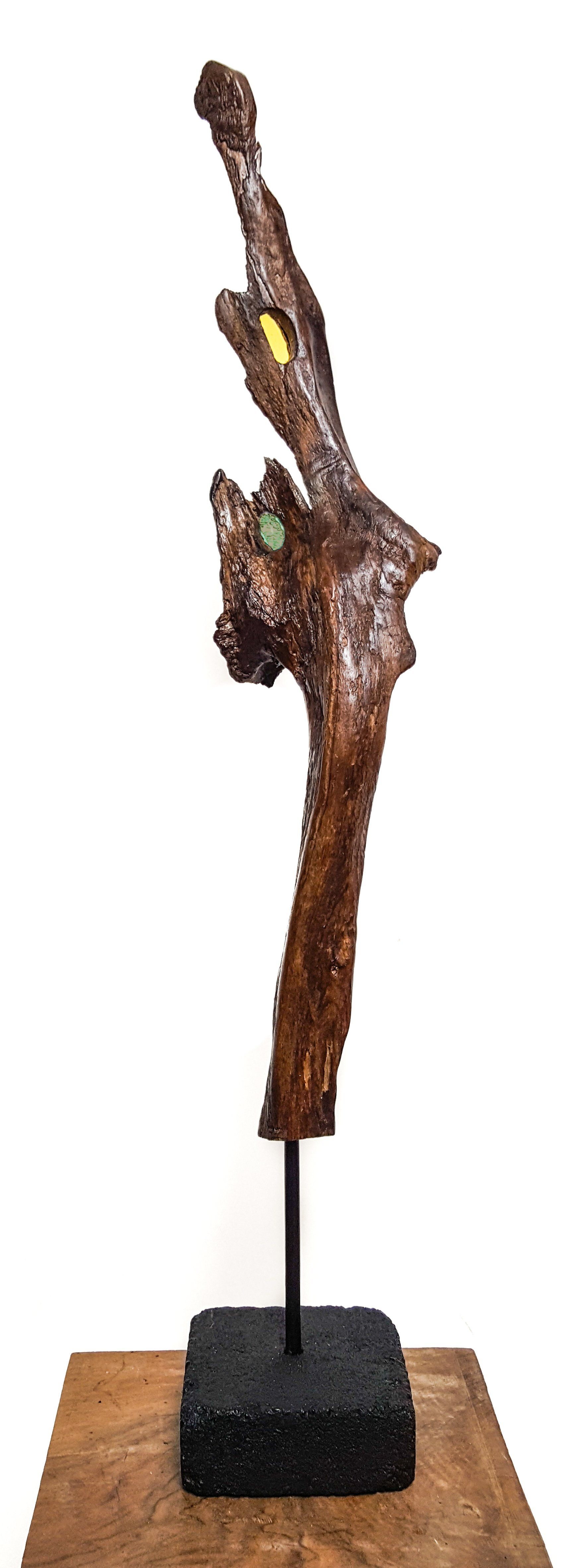 Bois flotté sur tige métal et socle pierre 1m80.