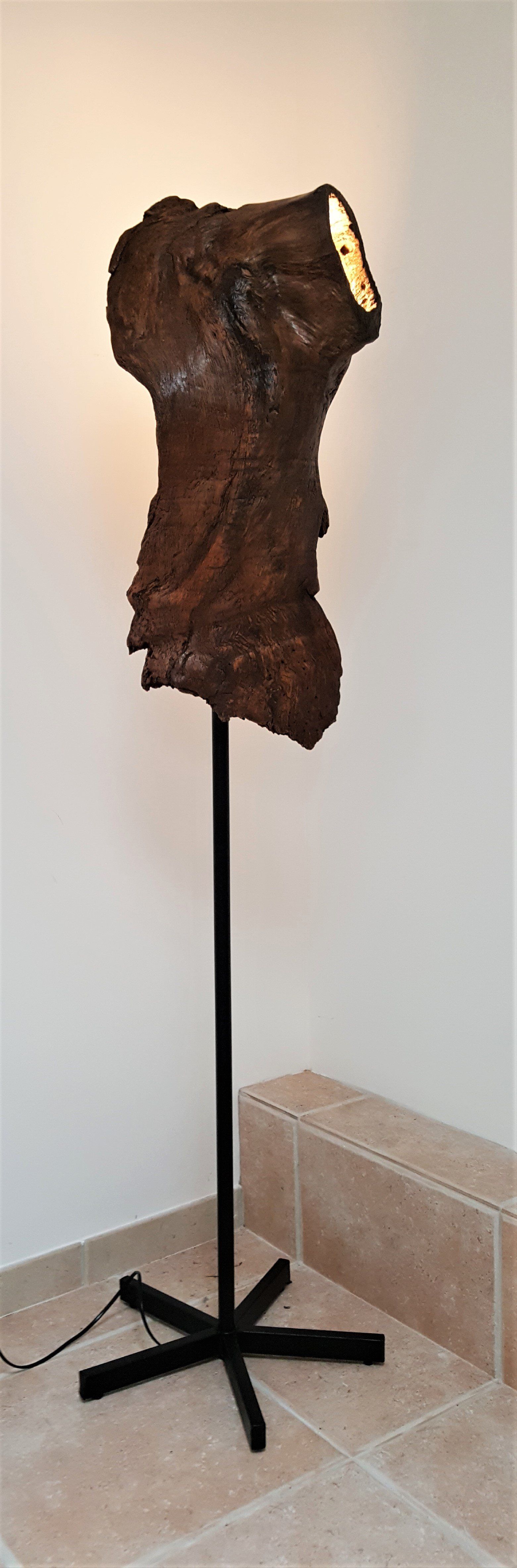 Souche acacia rétroéclairée sur montant métal. Oeil de verre. 1m70.