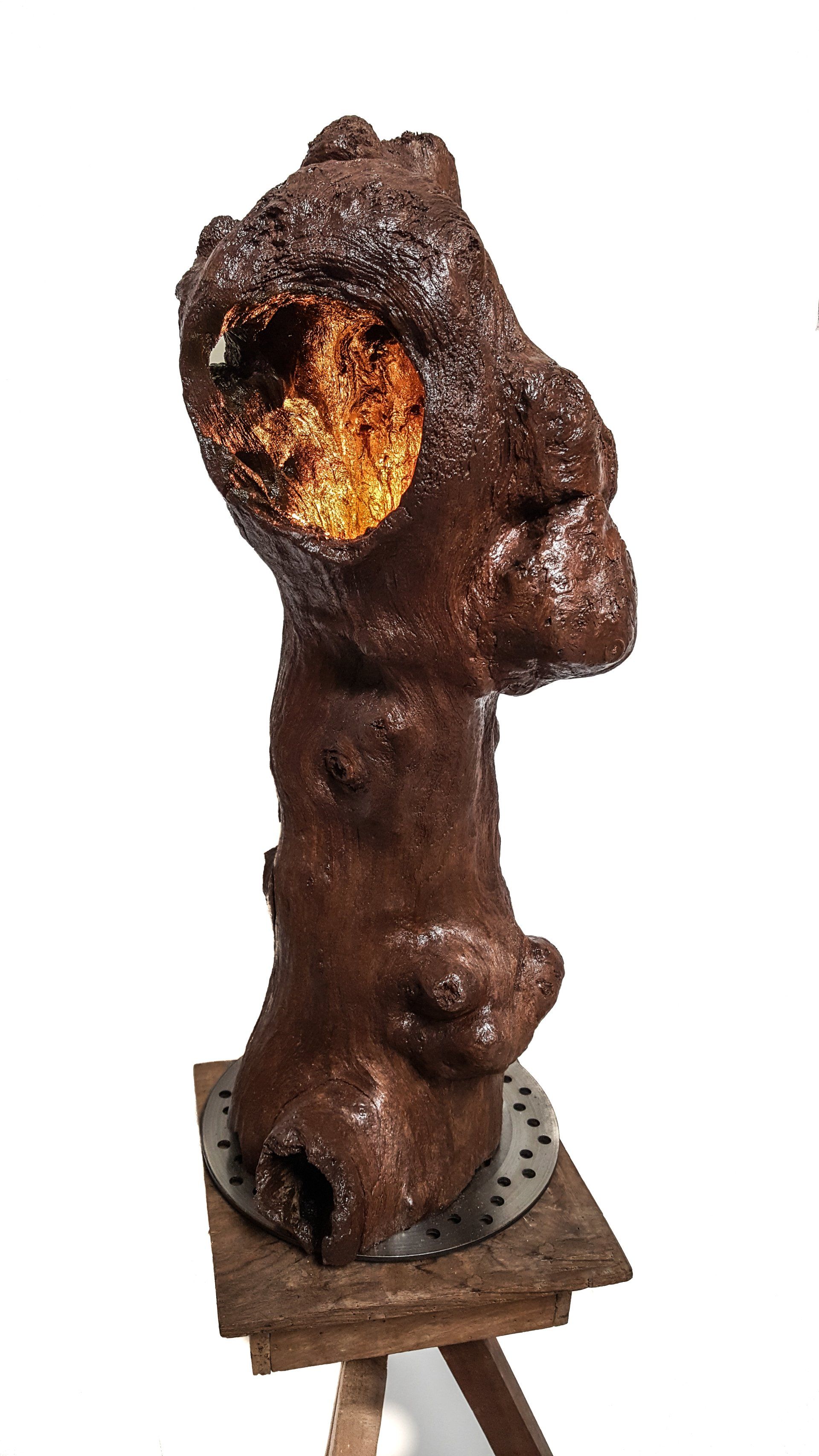 Souche acacia rétroéclairée sur montant métal. Oeil de verre. 1m70.