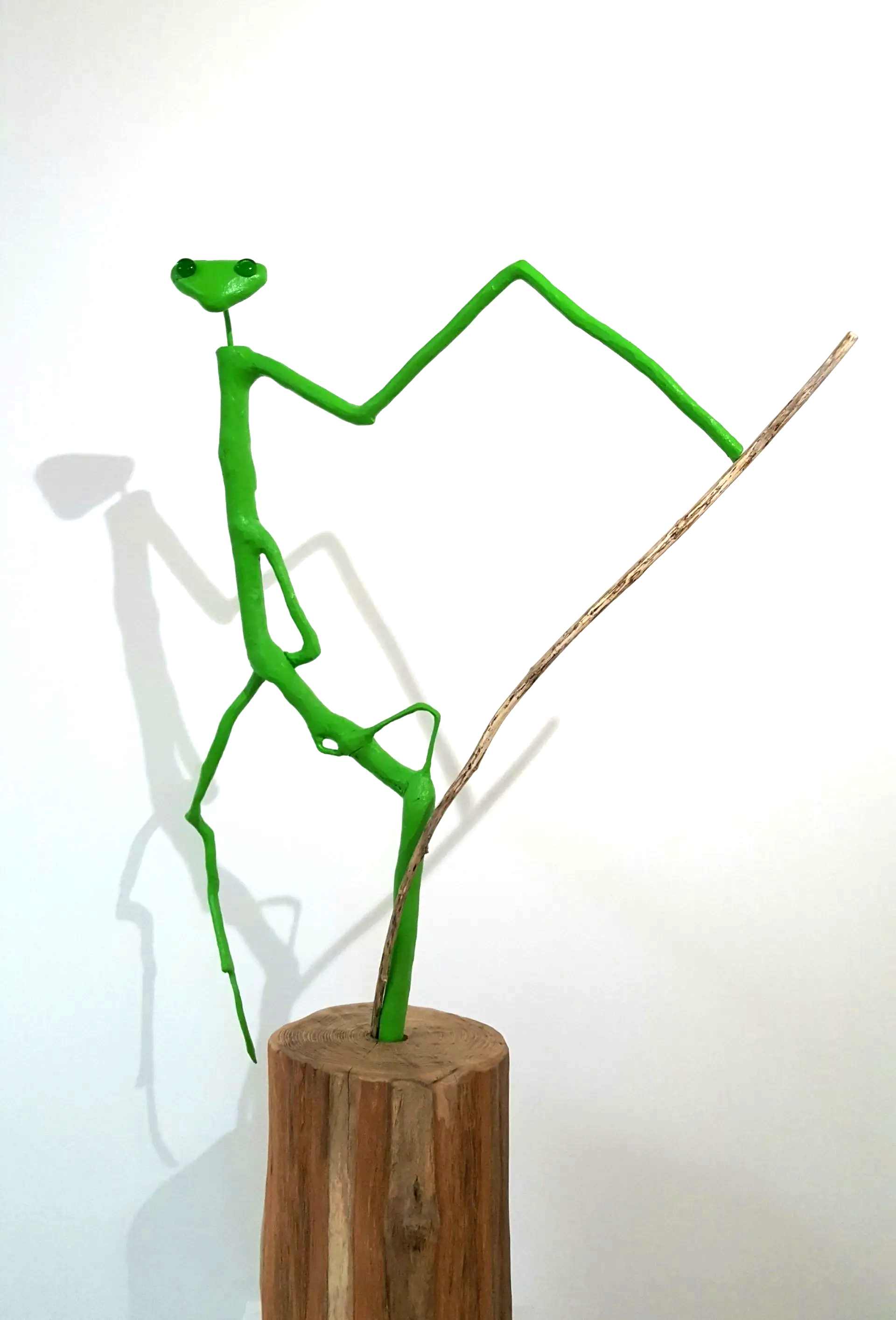 fouillis végétal et s'y projette. Ses oeuvres uniques et décalées sont parfois réalisées par le mélange de matières et matériaux improbables.